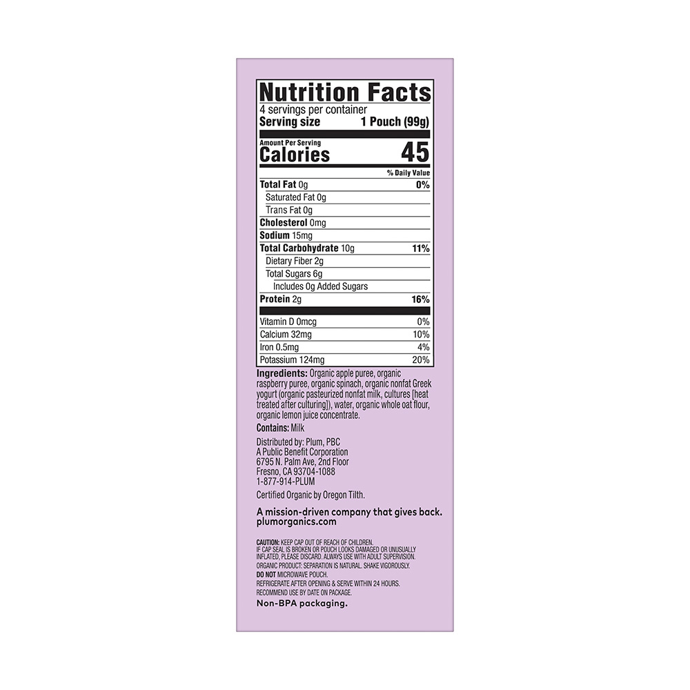 Organic apple puree, organic raspberry puree, organic spinach, organic nonfat Greek yogurt (organic pasteurized nonfat milk, cultures [heat treated after culturing]), water, organic whole oat flour, organic lemon juice concentrate
