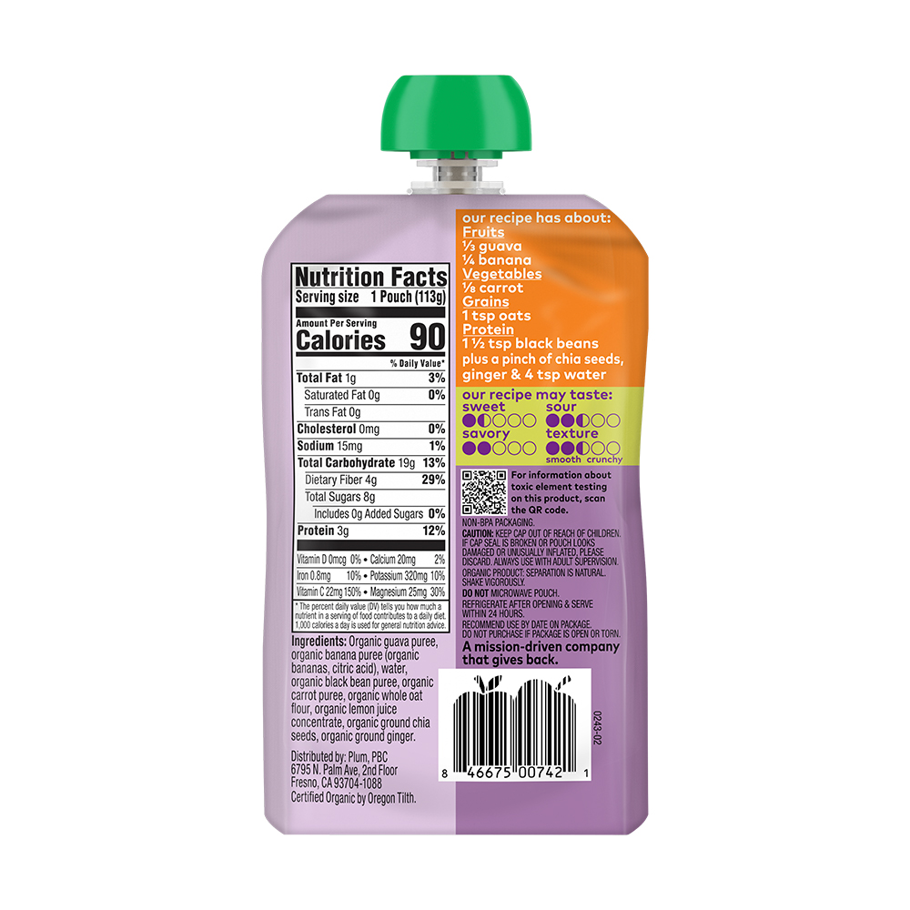 Encourage your little foodie to experience all four food groups with this mighty blend of guava, banana, black bean, carrot and oats!