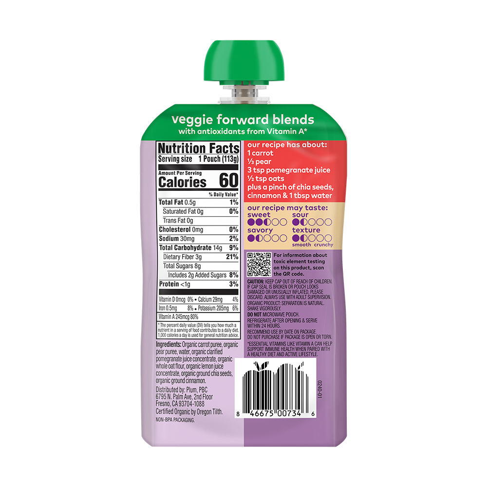 This blend of carrots, sweet pears, tart pomegranates and hearty oats will make your little one a veggie lover from the start!