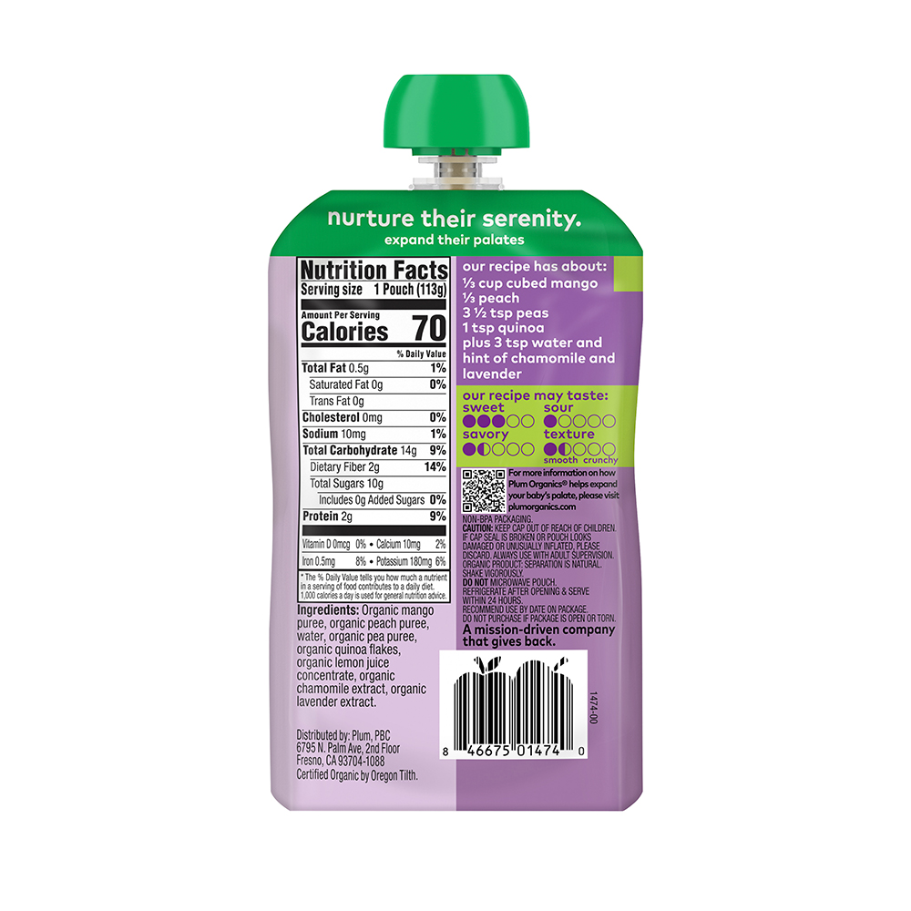 This pouch is the perfect balance of sweetness and serenity! Mango, peach, pea and quinoa blend with soothing botanicals to add a touch of tranquility to your tot’s mealtime.